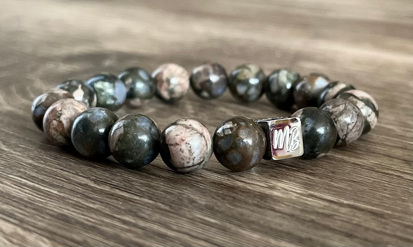10mm bead accented by a high polished silver tone stainless steel logo bead.
