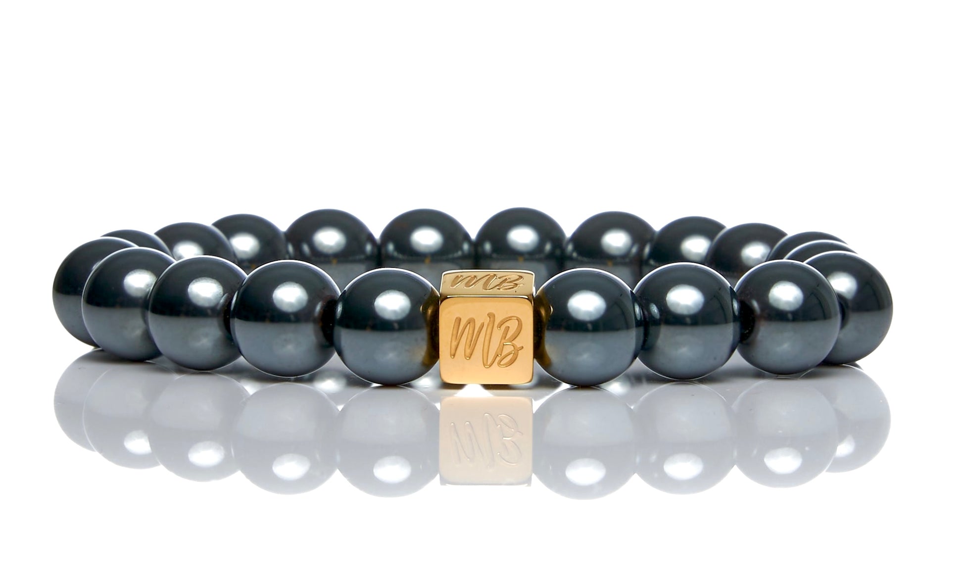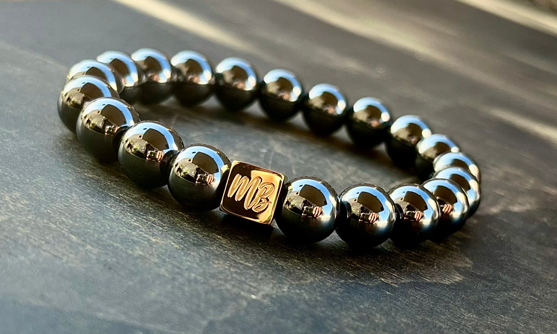 10mm beads accented by a gold finish stainless steel logo bead